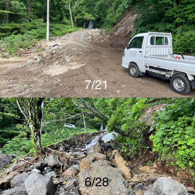 先月(6.27)の豪雨でエグくエグられた道路の復旧はこんな感じです。4WD車なら余裕。2WD車ならガッツが必要な状態です。宿泊のお客様の車は、天元台湯元Pに駐車頂き宿で送迎(14:00〜16:00)してますが、自前で仮復旧させた道をガッツで登って来て宿前に駐車頂くとテンションと復旧モチベーションがアゲアゲになるのはホンネですね。