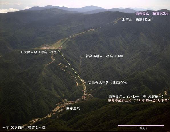 天元台高原より航空写真を拝借しました。おそらく1985年前後の空撮だと思われます。天元台高原、新高湯温泉、白布温泉の位置関係を表してみました。