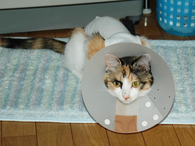 まめちゃん 経験からいってこの格好は、手術!? 傷口を舐めないようにという仕掛けですね。 我が家のゴンタも同じ体験をして今に至っておりますが、この後 すんごくデブ猫になりますよ。※ゴンタ種族の通常成猫体重:2.5〜3kg ゴンタの場合:5.5〜6kg (~_~)