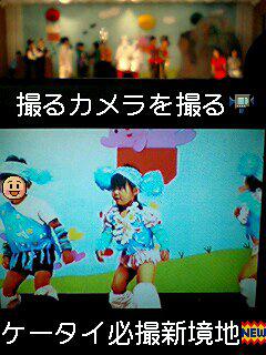 ケータイ必撮(シリーズ)の限界を一つ飛び越えました。 例えば幼稚園のお遊戯会など、ステージまで距離があり且つこちらは暗闇という状況下でのケータイカメラ撮影は向かないという定石をビデオカメラの液晶を通すことにより可能に(^_-)-☆ 画像は二女のゾウさんダンス?! 隣のちびっ子さんは個人情報の観点より顔を隠しました。 尚、ステージとカメラ液晶の光景が違うとお気づきの方がおりましたら、それはカメラを再生モードで一時停止させ液晶を撮ろうとしているうちに、次のステージが始まってしまったからなのです。 え? そんなのかんけ〜ねぇ?? ハイ おっしゃるとおりです(*^^)v