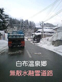 白布温泉郷内の道路(2km)は、無散水融雪道路という温泉熱とボイラーのハイブリッド装置により“雪が積もらない”(解ける)道路です。 “2km区間のみ”ですので、それまで(米沢市内〜白布)と、その奥(天元台〜新高湯温泉)は、しっかり道路に雪があります。 因みに、この県道2号線(米沢〜白布)は主要地方道に位置づけられており、維持管理(除雪等含む)の優先順位も準国道扱いになっているそうです。大雪で市内の除雪がいっぱいいっぱいの時も、この道路がしっかり除雪されているのはその為らしいです。 大雪のときこそ、どうぞ山奥に避難しにいらしてくださいね(^_-)-☆