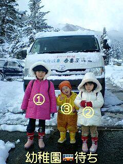 幼稚園バスを待つ、二人と・・・見送る一人。 バス待ちの僅かな時間に遊びすぎて、靴下交換一人、ズボン交換一人・・・見送る一人。