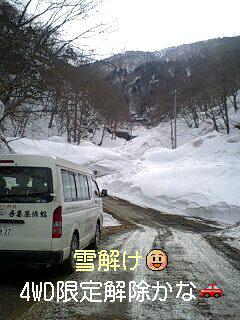 続く春の陽気にあれほどあった雪が見る見ると溶けて行きます。「雪道で4WD車でないと登れません」と先週までご案内しておりましたが、今朝の状態では2WD車でも部分的に気をつければ登れる雰囲気です。 ※それでも山の気候は油断大敵! 下界が雨でも山奥は雪という場合がありますので微妙なときは問い合わせてください(*^_^*)
