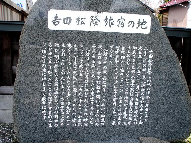 米沢市街に出て、前から一度是非よく見たかった、見なくてはいけなかった「吉田松陰旅宿の地」の石碑です。米沢市内、北部小学校の校門近くの街道沿いにあります。すぐ分かりますよ。歩道橋のそば。