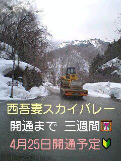 米沢・白布温泉と福島県・裏磐梯を結ぶ主要地方道2号線【西吾妻スカイバレー】が春の開通に向けて除雪真っ最中。(のようです) 4月25日(金曜日)10時開通 だと思います。(例年のパターン)