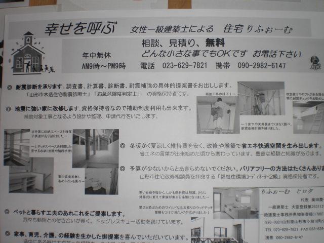 「山形市木造住宅耐震診断士」「応急危険度判定士」の資格保持者なので耐震診断ができるし、山形市住宅改修相談員を拝命する「福祉住環境コーディネーター2級」資格保持者なので、予算に合わせた改修をしてくれる。ましてやペットと暮らす工夫のあれこれも提案してくれるとのこと、すごい!と思った。もし、家の建築、リフォームをお考えの方は一度相談してみてはどうか?