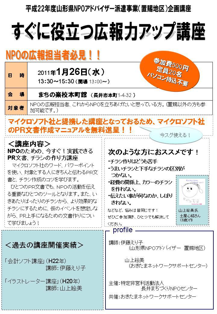 1月26日(水)13:00〜15:30まちの楽校本町館で「すぐに役立つ広報力アップ講座」をおきたまネットワークサポートセンターとの共催で行います。チラシの上手な作り方を学びたいNPOの方はご参加よろしくお願い致します。