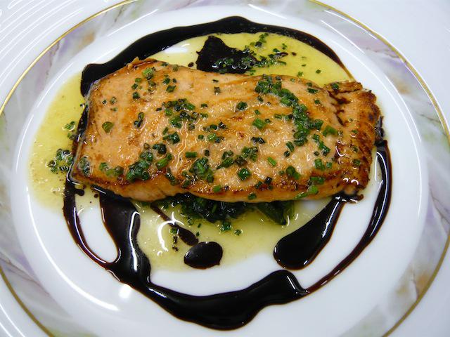 ソースは、自家栽培のシブレット(チャイブ)のレモンを利かせたブール・ブランソースと煮詰めたバルサミコでアクセントをつけています。