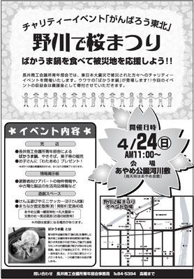 しとしと雨の降る山形県長井市です。天気予報では明日まで少し寒くなるのだとか。桜が咲くためにはある程度の低温期間が必要とのことなので、これで開花がちょっと早くなるかもしれないですね(^∇^)さて、来る4月24日(日)にあやめ公園河川敷にて、東日本大震災で被災された方々へのチャリティーイベント「野川で桜まつり」が開催されます('ー^*) 長井市商工会議所青年部会の主催で行われるものです。当日は昨年の平成鍋合戦で“鍋の局”に輝いた「ばかうま鍋」や焼きそばなどを販売。売上を寄付するほか、募金も行います。また、避難者向けの物件や中古家電などの生活用品の情報も掲示します。お子様向けのけん玉やミニサッカー、長井市の歴史を訪ねるまちなか散策も行いますよ(ノ*^▽)ノ私たちもながいファン倶楽部チャリティーポストカードセットを持って伺います。ふるってご参加ください!【この記事は、ながいファン倶楽部のブログです】☆毎月1日・15日にファン倶楽部会員様へメールマガジンを配信♪▼お申込はこちらから!*.*:*.*:*.*:* がんばろう東北!がんばろう日本! *.*:*.*:*.*.*震災における長井市の対応はこちらから(長井市ホームページ)長井市災害避難者支援ボランティア本部のブログはこちらから長井市でも支援の輪が広がっています→こちらからどうぞ長井市生活情報マップはこちらから仕事を提供するという支援〜サイトーモールド被災地への義援金についてはこちらから地震関係Q&A(山形県ホームページ)計画停電について(東北電力ホームページ)