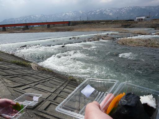 わずかに残っていたおにぎりを売店で買って、マダムと二人で川っぱたに腰かけて雪解けの川の流れと長井線の鉄橋と西山を望みながらランチタイムです。ちょっと風が強くて肌寒いながらも爽快な気分です。