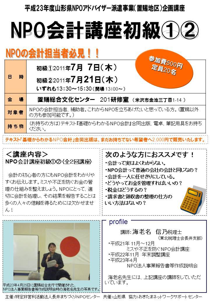 ・対象者:NPOの会計担当者、補助者。これからNPOを立ち上げたいと思っている方。置賜以外の方も参加可能です。