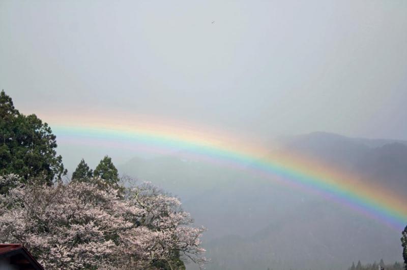虹とのコラボですw私の家の二階から撮影しました。4月15日の朝に撮影しました(^^)昨日は3割ぐらいさいていましたが、いっきに8割〜9割ほど咲いたようです◎今日の強風と雨で散らないといいけど(><)明日から桜の売店もはじまります!是非足をおはこびください。また、看板に、とっても素敵な歴史の話が書いてあるので必見ですよ!!!