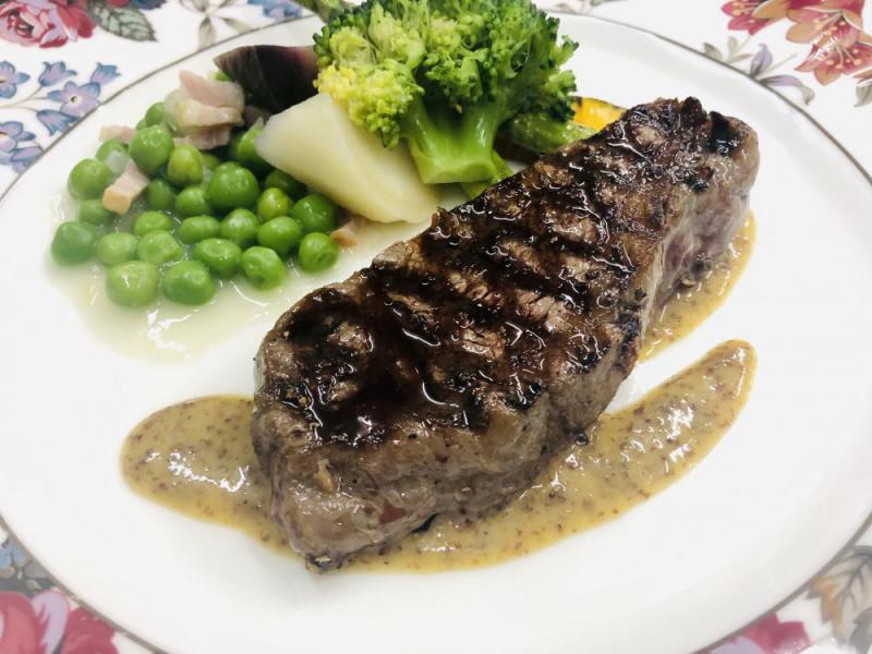 おはようございます。今日もいい天気になりました。白ツツジも咲き始め、明日から長井は黒獅子祭りが始まりますよ。何体もの黒獅子が舞う勇壮なお祭りを見に是非おいで下さい。写真は牛フィレ肉のグリル、マスタードソースと黒獅子が我が家の店先で大口お開けて舞っているところです。^_^