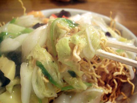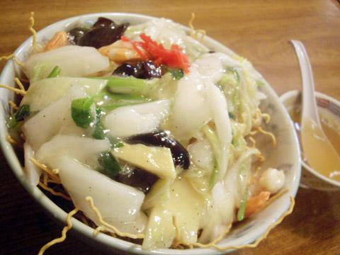 こちらのメニューに「揚げ焼きそば」は何種類かありますが、今回はエビがごろっと入った「エビ揚げ焼きそば650円」を食べることにしました!店員さんが持ってきたときのあのボリュームを見たときはびっくり感動です(ただ、私が大盛り好きなだけかも)!濃いめの味がお好きな方には、なおさら好きなお店ですよ。揚げ焼きそばのパリッとした麺が、あんによって少ししなびてくるところがおいしいんですね!