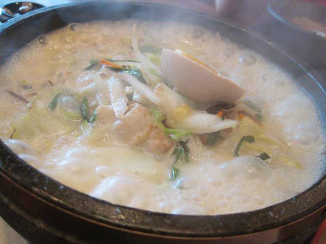 熱々に熱した石鍋に、茹でた麺とたくさんの野菜をのせて、