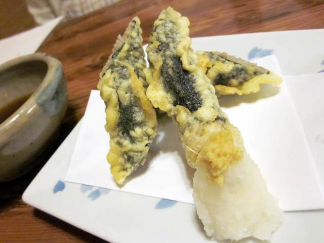 そばとしその葉を海苔で巻いて天ぷらにした、