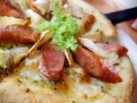 ピザ生地にソーセージをのせてカリっと焼きあげた、