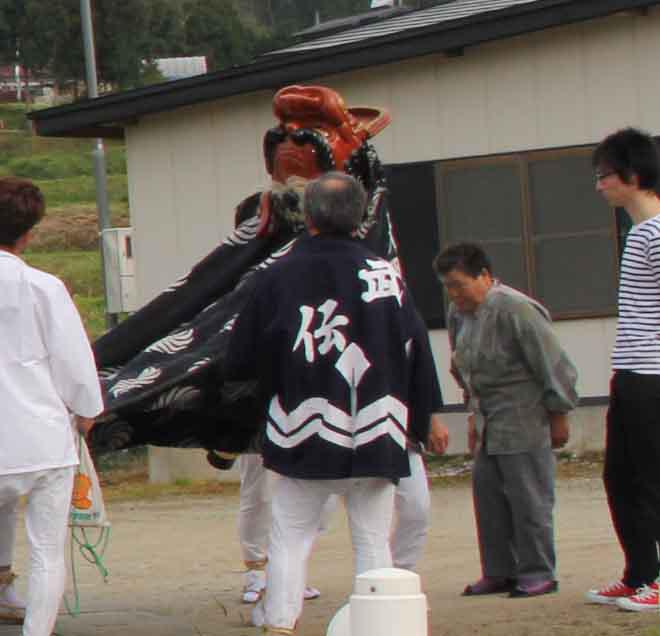何やらトラブっている様子、頭が道具箱から糸を出して獅子頭と幕の縫製修理をしていた。