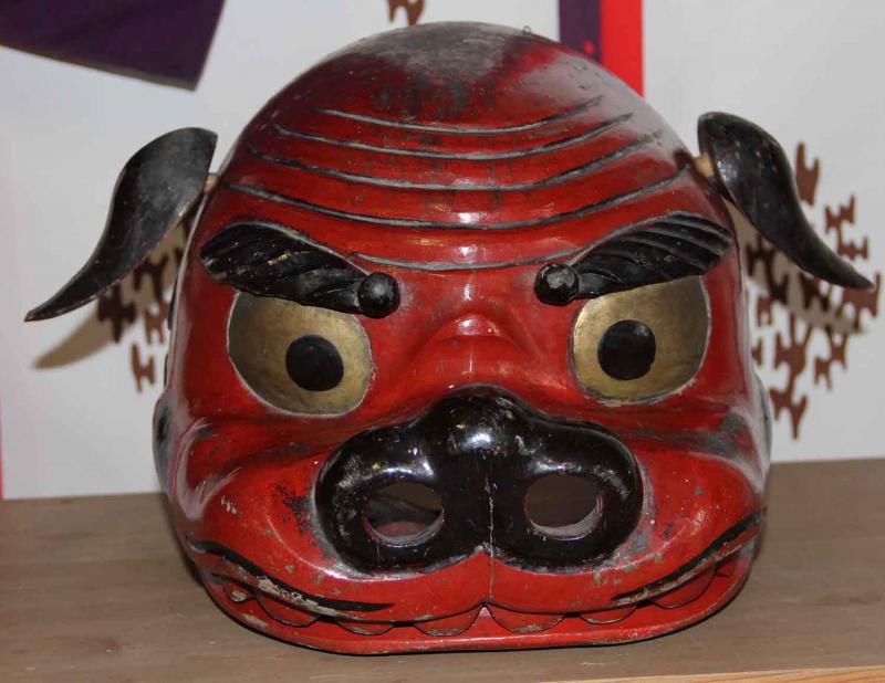 詳細不明の赤い神楽獅子であるが、あまり使い込んだ様子は無く中に記名も無い。