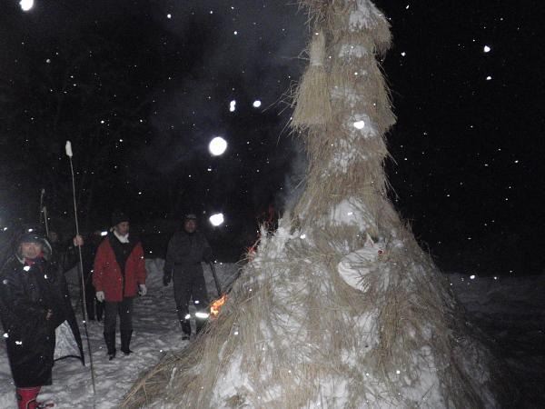 写真は積み上げた稲わらに火をつけたばかりのとき。