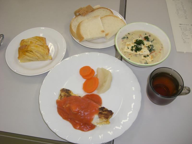 メニューは牡蠣のチャウダー・鱈のピカタ・りんごのケーキを作りました。