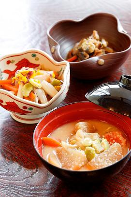 写真は手前から「遠山蕪の粕汁」「雪菜の冷汁」「ひょう干し煮」です。