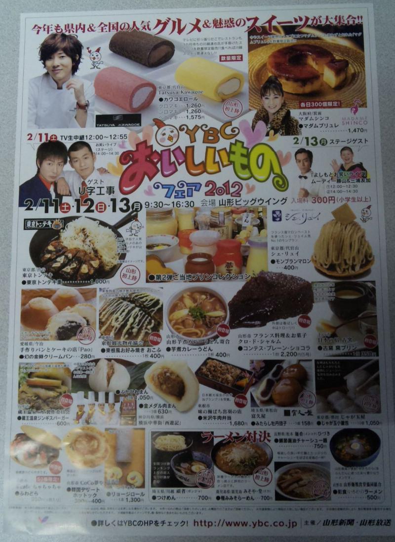 2月11日(土)〜13日(月)9:30〜16:30、山形ビッグウイングで行なわれます。入場料は300円(小学生以上)です。11日(土)はゲストにU字工事が来ます。かなり混むと思いますが、是非お越し下さい。チラシ見でっと、どれもおいしいものばりで買いっちぇ(◎o◎)