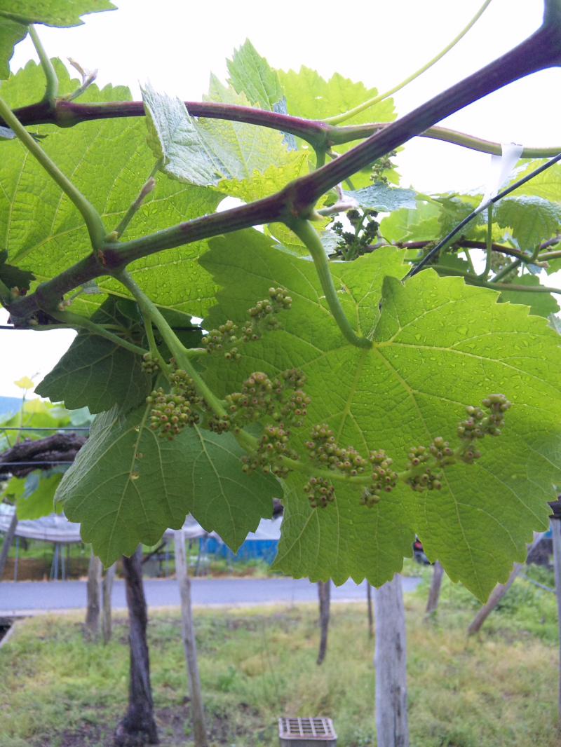 まだ蕾の段階だげんと、中心部がポツーンと赤くなり、黒ぶどうの雰囲気を醸しだしています。これから雨の多い時期になっけんど、雨にも負けず順調に育って欲しいです。