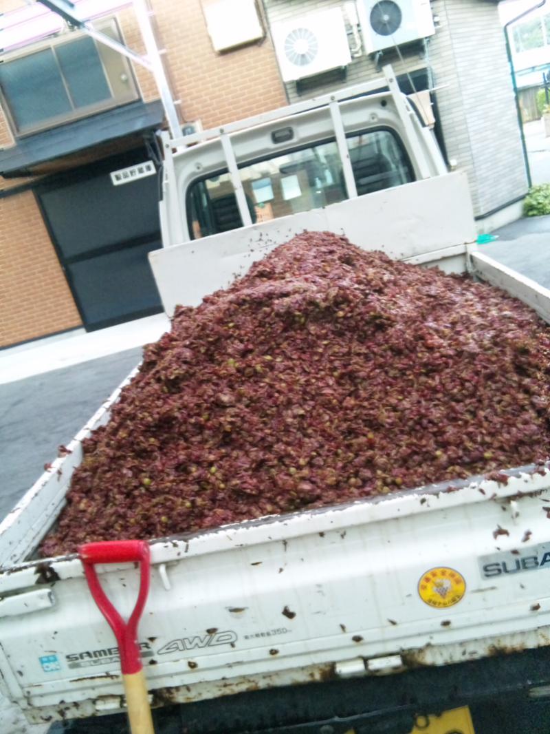 今年は雨降んねがら、実割れしたぶどうがほとんどなく、健全な状態のもので仕込みが出来て、ワインも期待大です。今日は約3トンのデラウェアーで、辛口タイプ用のワイン仕込みを行ないました。ぶどうのイメージからデラは甘いワインを連想すっけど、おらいではデラのフルーティーさを活かした比較的飲み易い辛口も造っています。画像は今日搾ったデラの搾りかす。