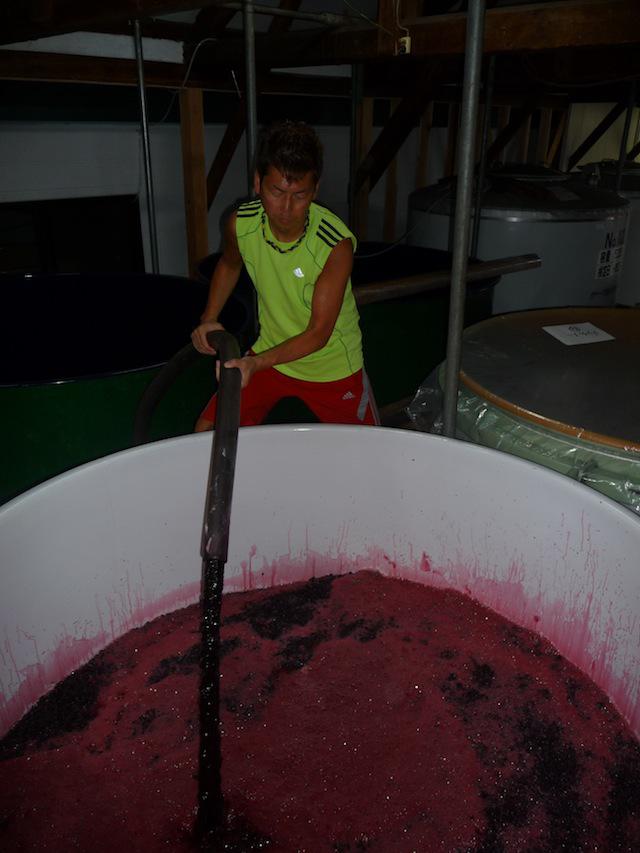 昨日仕込んだベリー・アリカントAのタンクを攪拌しているところです。醸し発酵をする赤ワインは、櫂入れという攪拌する作業を毎日します。ちちゃこいタンクだと櫂棒で十分攪拌出来っけど、おっきなタンクだとそうもいきません。下の呑み口からポンプで発酵液(ワイン)を上げて、醪の表面にかけて循環させます。