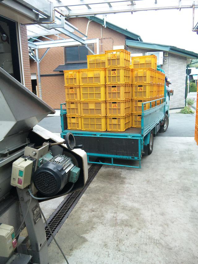 今年2回目のベリー・アリカントA。約2トンを仕込みました。先々週仕込んだ時よりも、もちろん糖度が上がり酸味のレベルは下がってました。今回のは少し熟成させて、おらいの『山形ワイン・赤』のブレンド用になる予定。画像は仕込み場へ到着するベリー・アリカントA。