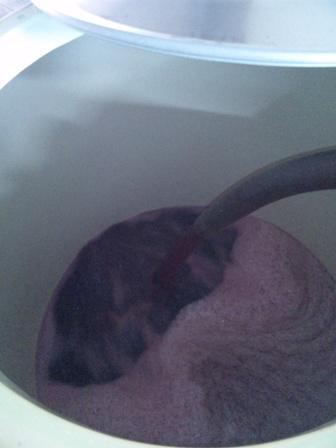 搾汁したマスカット・ベリーAの果汁を発酵タンクさポンプで送っているところ。色と味わいがチャーミングの『ブラッシュベリー』用に造ります。このワインはここ数年、国産ワインコンクールロゼ部門で入賞を続けているので、今年も安定した品質に仕上げていきます。ベリーAの特長であるきれいな酸味とのバランスを考えて、あんまり甘すぎず、ちょうどいい塩梅ささんなね。あとブラッシュワインだから、色ももちろん気つけんなね。