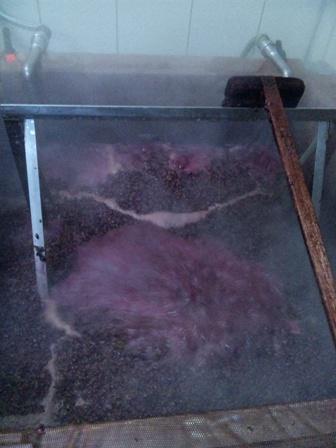 原液仕込みもワイン仕込み時と同じくポンプが使えず、破砕した実を圧搾機まで従業員総出でタライリレー。今年のカベルネは手こずったなぇ(*_*)