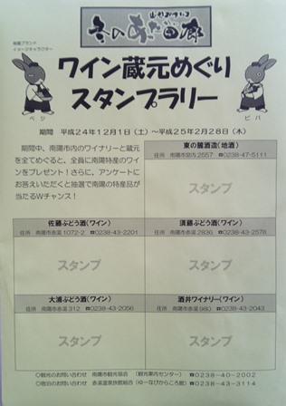 来年の2月28日(木)まで赤湯のワイナリー4社(大浦、佐藤さん、酒井さん、須藤さん)と宮内の酒蔵(東の麓さん)を全てまわるとワインプレゼントのスタンプラリーをしてます。
