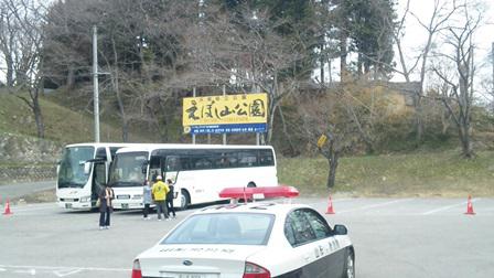 本来なら、この駐車場も大型バスでいっぱいになるはずが、たまーにポツラポツラ来る程度。手前にパトカー停まってだげんと、車上狙いが多く時々パトロールに来てました。車を長時間停めて花見をする時は必ずカギをかけましょう。