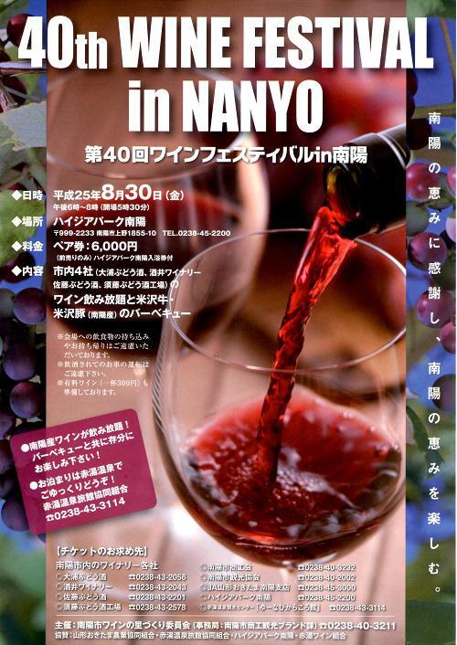 製造の佐藤和洋です。ワインフェスティバルの開催概要がきまりましたのでご案内致します。第40回ワインフェスティバルIN南陽日時:2013年8月30日(金)時間:18:00〜20:00(開場17:30)場所:ハイジアパーク南陽料金:お一人様¥3000円(販売はペア券のみの6000円)定員:200名限定・前売り券のみです。当日券はありませんのでご了承ください。今年もワインフェスティバルの時期がやってまいりました。南陽のワイナリー4社金渓ワイン・佐藤ぶどう酒 3種類(赤・白・ロゼ)紫金園・須藤ぶどう酒3種類山形ワイン・大浦ぶどう酒 3種類バーダップ・酒井ワイナリー 3種類の合計12種類のワインが飲み放題・有料ワインコーナーもございます一杯300円です例年通りバーベキュースタイル。米沢牛120g(A-3〜4の間)と米沢豚120g合計240gプラス野菜その他に、チーズや枝豆などの簡単なおつまみが付きます。お楽しみ抽選会もあり、今年の景品は山形置賜農業協同組合様より:お米2k×5名赤湯温泉旅館協同組合様より:温泉宿泊券1名ハイジアパーク南陽様より:招待券5名赤湯ワイン組合より:ワイン8名様分 合計19名様に景品が当たります!!とてもボリューム満点なワインフェスティバルです。定員が200名ですので、チケットの完売が予想されますのでお買い求めの際はお早めに!!県外からお越しの方でご宿泊をお考えの方は是非赤湯温泉へ お問い合わせは赤湯温泉ゆーなびからころ館までお問い合わせ下さい。主催者:南陽市ワインの里づくり委員会 在庫:数量:
