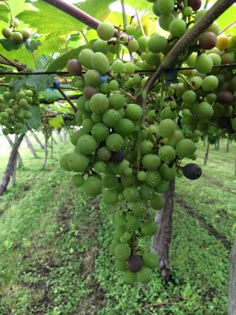 画像は今現在のベリー・アリカントAという赤ワイン専用品種です。9月上旬に収穫出来るので、色がついた実も出て来ました。