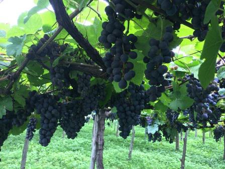 現在のベリー・アリカントA。例年9月上旬に収穫して、ヌーヴォー用に仕込む赤ワイン用の品種です。今にでも収穫しても良い位の着色の具合ですが、まだ酸味がやや強く感じるので、あともう2週間程そのままです。