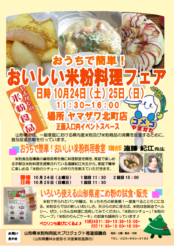 24日11:30〜、15:00〜及び25日11:30〜から『簡単!おいしい米粉料理教室』を開催します!