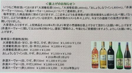 大変恐れ入りますが、上記商品を2016年4月1日より希望小売価格を値上げさせて頂きたくお願い申し上げます(赤湯ヌーヴォーに関しては2016年の秋から)。