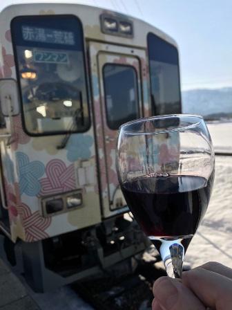 赤湯、荒砥感を走るフラワー長井線。この冬計3回のワイン列車を企画しましたが、残念ながら2月3日のが大雪で中止になり、本日(3月3日)が最後でした。今日のワイン列車に乗せて頂き、ワインの説明の担当を仰せつかりました。乗客の皆さんに往復、ワインを注いだりワインの話しをしたり、あっという間のワイン列車でした。