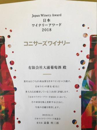 日本のワイナリーを評価する「日本ワイナリーアワード2018」にて、コニサーズワイナリーを受賞致しました。