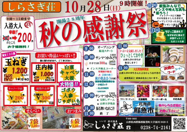 実りの秋です。しらさぎ荘も今年の収穫に感謝し、日頃ご愛顧頂いてるお客様への感謝を込めて秋の感謝祭を行わせていただきます。サンマのつかみ取りや、浜焼きコーナーなどもあります。又、当日の祭り開催中は大人入浴400円のところ半額の200円で入浴できます!10月28日は是非しらさぎ荘にお越し下さいネ。