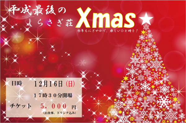 平成最後のしらさぎ荘のクリスマスパーティーは12月16日(日)に決定しました!小国のシンガーソングライターの皆様をお迎えして楽しく、おいしいごちそうで、楽しいクリスマスを過ごしましょう!ひと味違うXmasですよ!