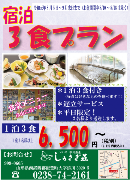 8/5〜お盆期間を除き、9月末日までしらさぎ荘恒例、3食プランを開催いたします!暑さで疲れている体を、天然温泉でゆったり癒して下さい!お待ちしております