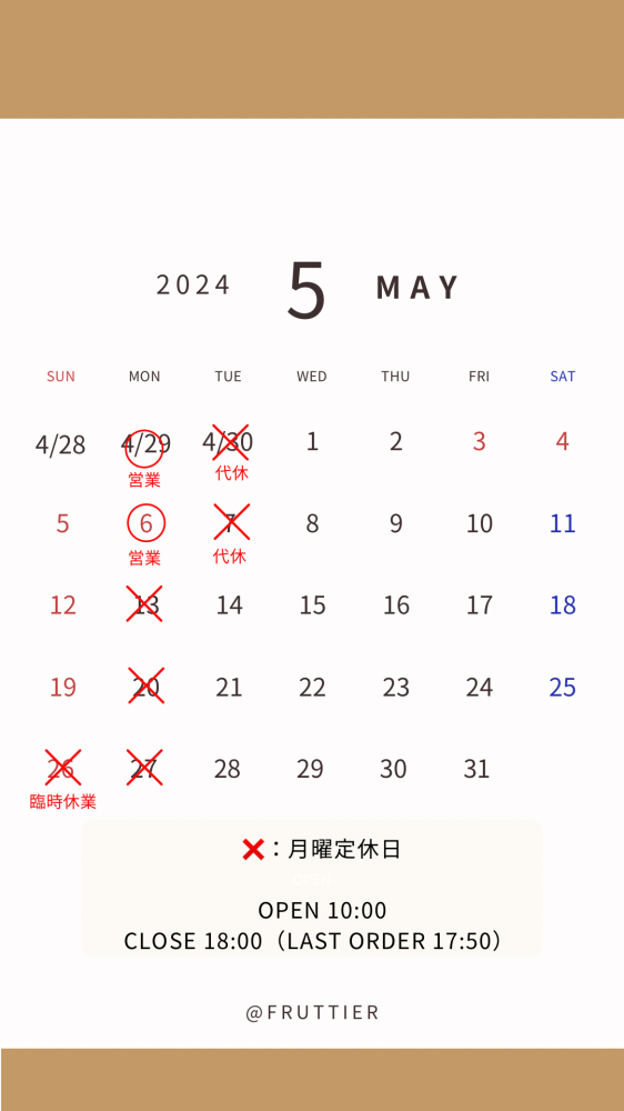 5月営業日カレンダーGWは、4/27.28.29.5/1.2.3.4.5.6営業いたします!※4/30.5/7は代休となります。皆様のご来店をお待ちしております!
