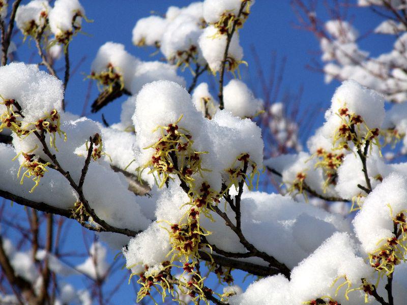 春の雪がマンサクの花について真っ青な空に見事な美しさに感動