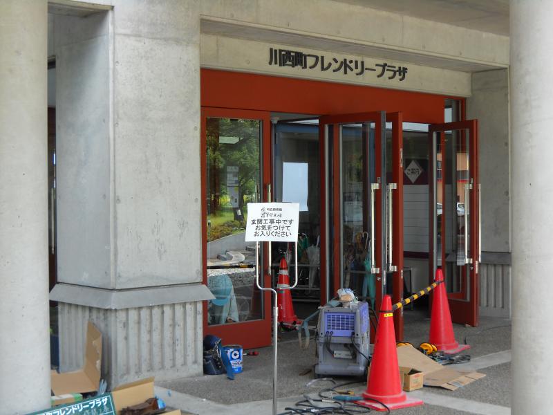 本日図書館では正面玄関の塗装工事をおこなっています。