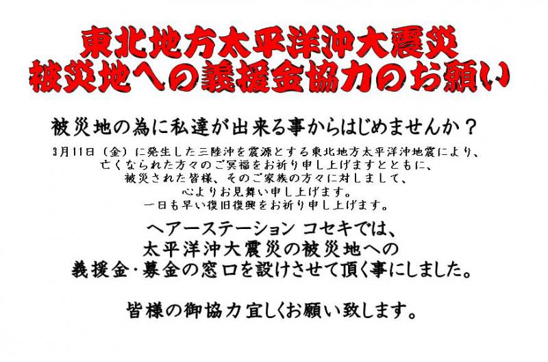 東北地方太平洋沖地震の被災地のために出来ることからはじめませんか?『義援金/寄付/募金/支援/チャリティー』 ヘアーステーションコセキ