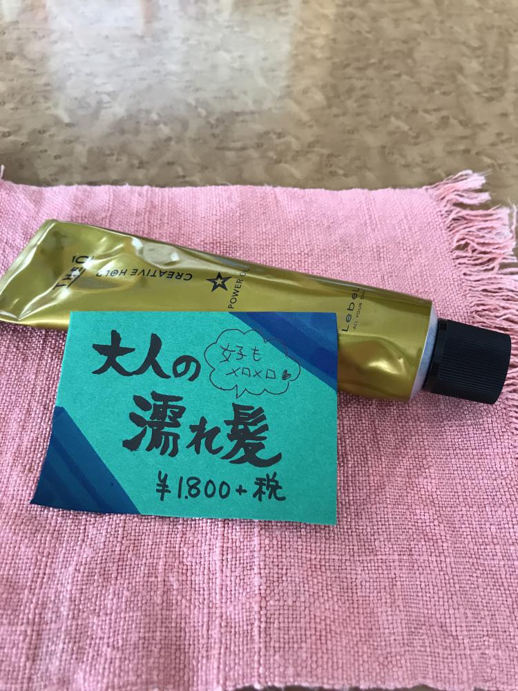 新しく入荷の商品発売前から、実は知っておりまして…講習先のイケメン講師がお試しで使っていてすごく良い感じだったんです。使ってみて、どどどーーーーーーーんの衝撃!扱いやすい!ぺたつかない使用感、つけた後の濡れ感、嫌じゃない香り…「大人男子」向き女子ウケすること間違いなし!って、使ってる私がメロメロしてます(笑)ぜひお試しください